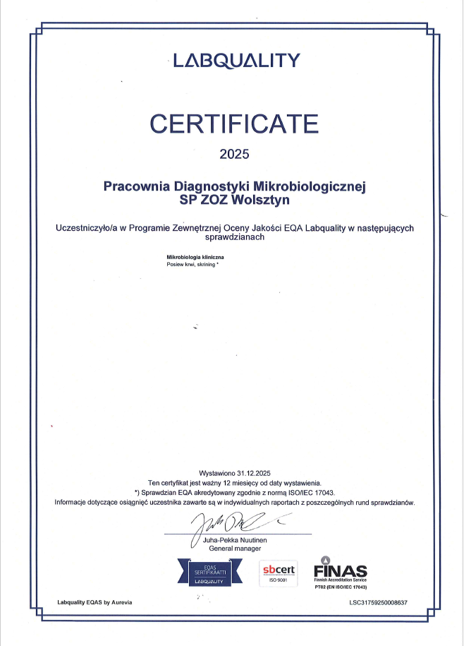 Pracownia Diagnostyki Mikrobiologicznej posiada certyfikat jakości PN-EN ISO 9001:2015-10.