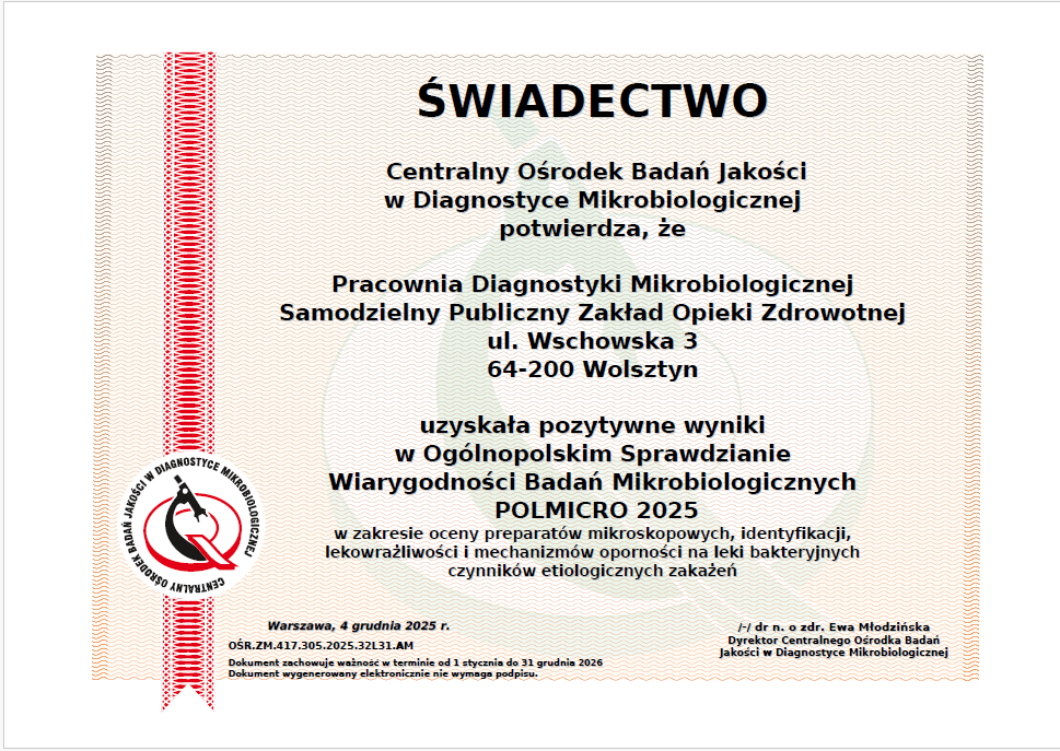 Wiarygodność badań wykonywanych w Pracowni Diagnostyki Mikrobiologicznej potwierdzana jest od wielu lat bardzo dobrymi wynikami w Ogólnopolskim Sprawdzianie Wiarygodności Badań w Mikrobiologii POLMIKRO.